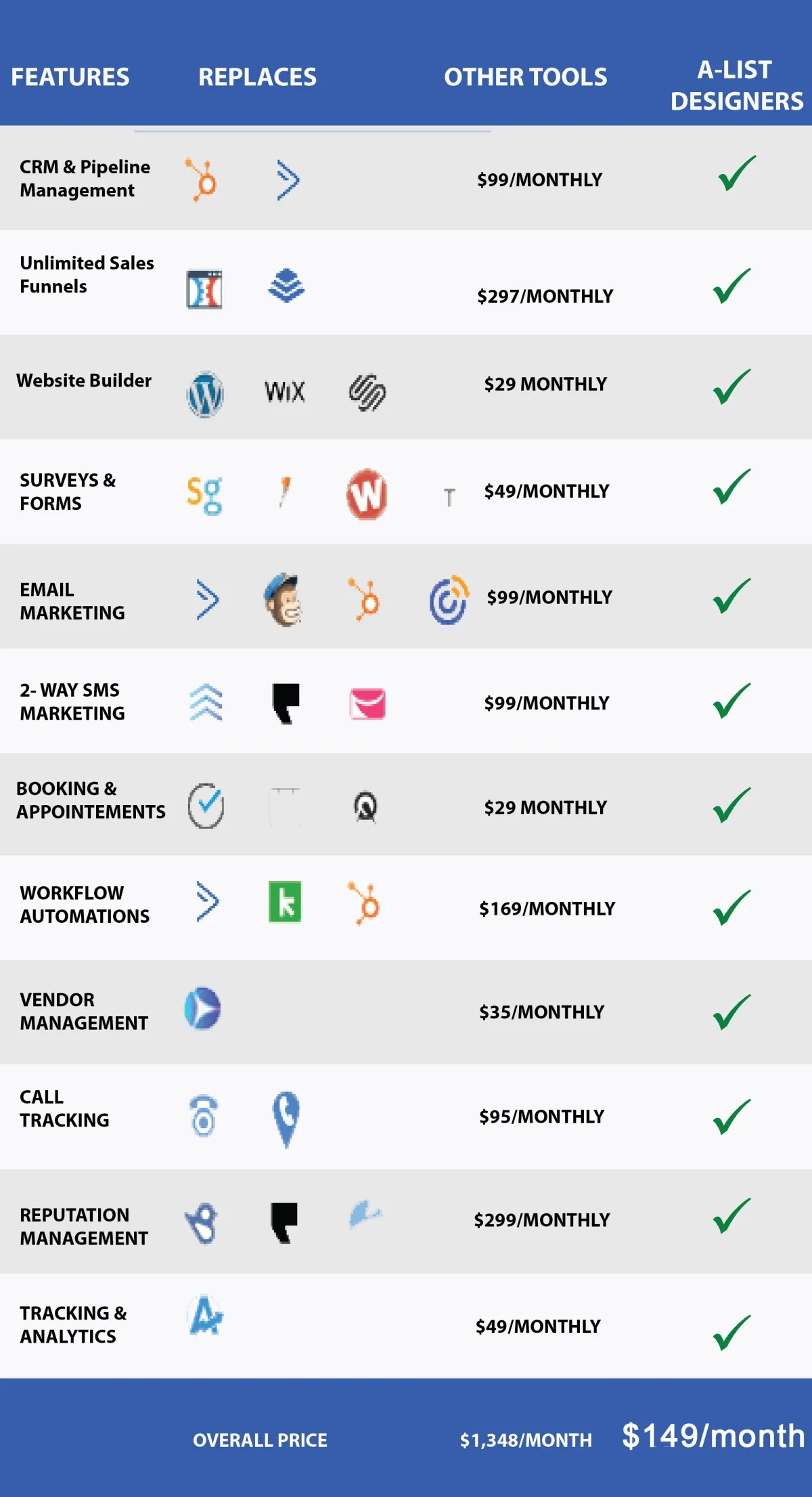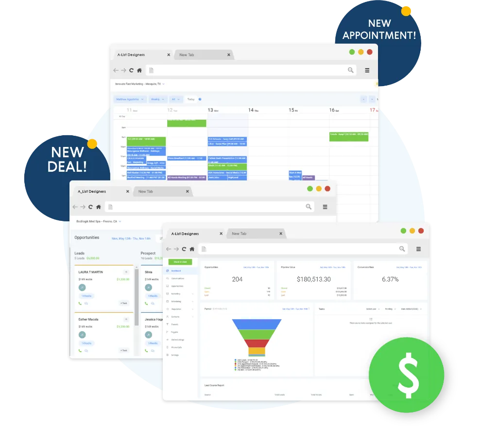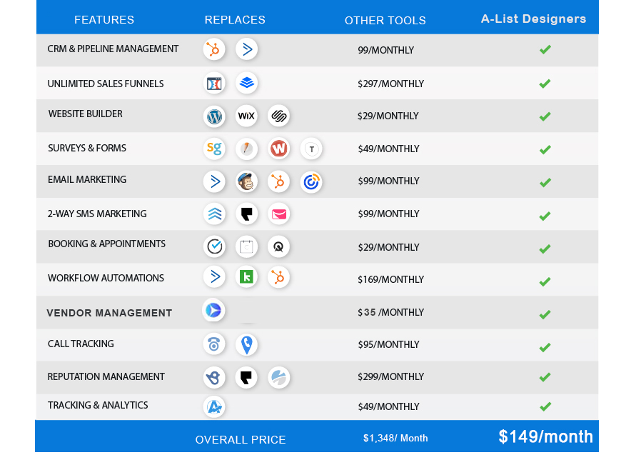 No, our Software replaces many other app’s including, emails, website builders, team management, SMS messaging, Call tracking, Reputation Management, Appointments / Calendar, Survey & Forms, Sales Funnels, etc.